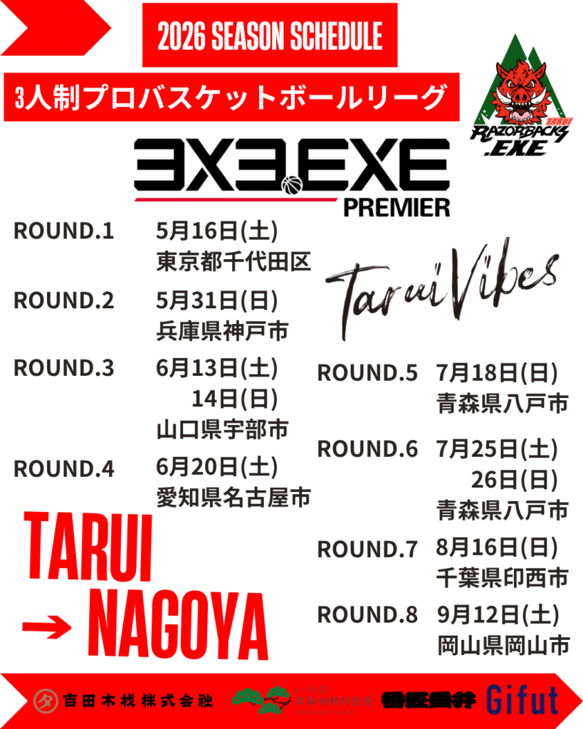 下記の通り垂井レイザーバックス(EXE PREMIERではTARUI RAZORBACKS.EXE)は2026年シーズンのロスター登録をしたことをお知らせ致します。